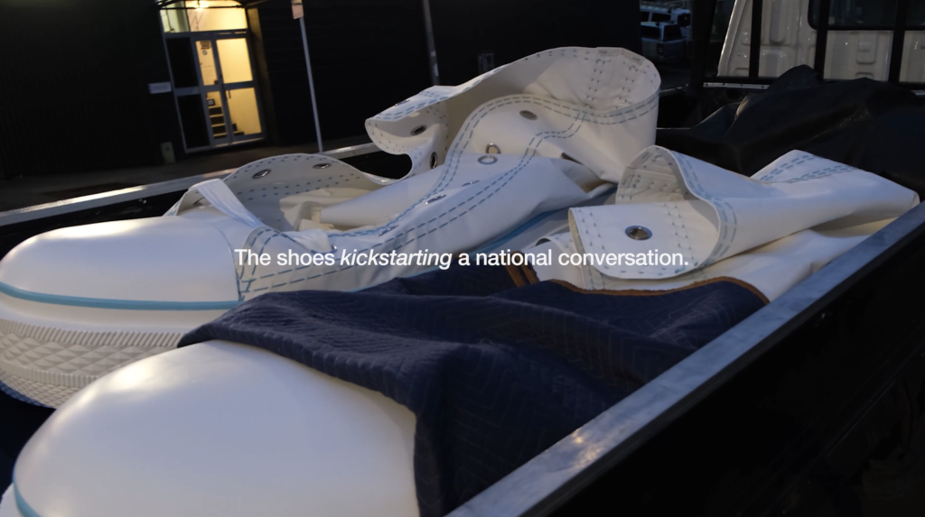 We’re giving away a pair of giant sneakers, each 2.4 m long, 750 mm wide, with a canvas top that folds down to just 400 mm high.